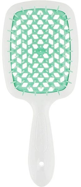 Щітка Janeke - цілісна. Зубчики вилиті у формі разом із основою та виконані з м'якого та гнучкого пластику. Основа трохи випукла за формою і зроблена за типом решітки, тонка та гнучка. Поєднання такої конструкції та напівм'якого пластику створює масажний ефект. Тому це не просто гребінець, а саме масажна щітка. Щітка зручно лежить у руці. Корпус щітки зроблений з легкого, проте міцного твердого пластику. Короткийта ергономічний дизайн.