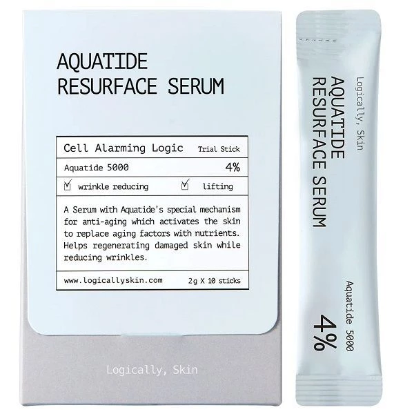 До складу формули Logically, Skin Aquatide Resurface Serum входить запатентований синтетичний пептид Aquatide 5000™, який діє на клітинному рівні та регулює цілу низку фізіологічних процесів в шкірі. Цей пептид був розроблений як біоміметик PCA (піролідонкарбонової кислоти), що є одним з компонентів натурального зволожувального фактору рогового шару епідермісу, та характеризується кращими вологоутримуючими властивостями та високою стабільністю. Він стимулює біосинтез довголанцюжкових керамідів, що підтримують цілісність гідроліпідного бар’єру, зменшує трансепідермальну втрату води, покращує еластичність шкіри, посилює антиоксидантну активність в клітинах.