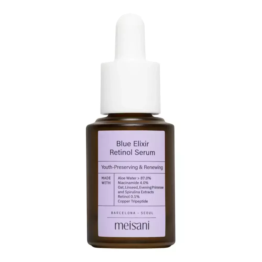 Легка флюїдна консистенція сироватки Meisani Blue Elixir Retinol Serum не залишає жирності на шкірі та миттєво поглинається. Має лавандово-блакитний відтінок завдяки вмісту екстракту спіруліни, без віддушок, 100% веганська формула.