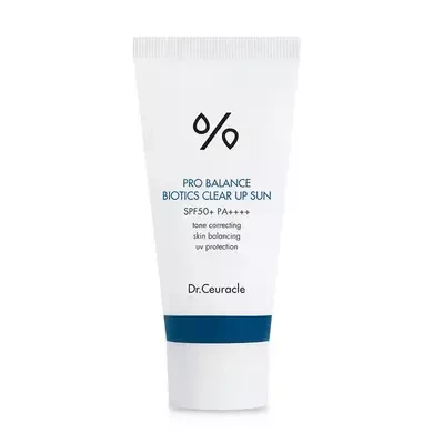 Dr.Ceuracle Pro Balance Biotics Clear Up Sun SPF 50+ PA++++ має легку текстуру, швидко вбирається, не викликаючи почуття липкості.