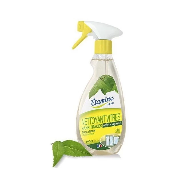 Склад: 30 % вода, 5 % неіоногенні ПАР (з цукру), аніонні ПАР (з пальмової олії), етанол (рослинний спирт), аланінат карбоксиметил тринатрію (cеквестранти), гідроксиметил гліцинат натрію (консервант). Без агресивних миючих хімічних речовин. засіб ефективно очищає та надає блиску склу, скляним та дзеркальним поверхням, не залишаючи розлучень. Має антистатичні властивості, запобігає повторному осіданню пилу. Завдяки концентрованій формулі економічно у використанні. Не подразнює шкіру рук і дихальні шляхи. Органічна продукція Etamine du Lys сертифікована відповідно до міжнародних стандартів. 28 днів – тестування OCDE302B).Засоби Etamine du Lys не містять продуктів нафтопереробки, силікону, фталатів, фосфатів, фосфору, ЕДТА, окислювачів, оптичних відбілювачів, штучних ароматизаторів, барвників, консервантів. Сертифіковано та вироблено під контролем Ecocert Greenlife F32600.