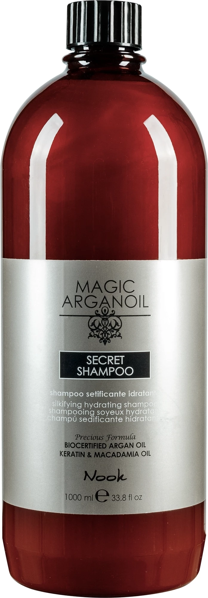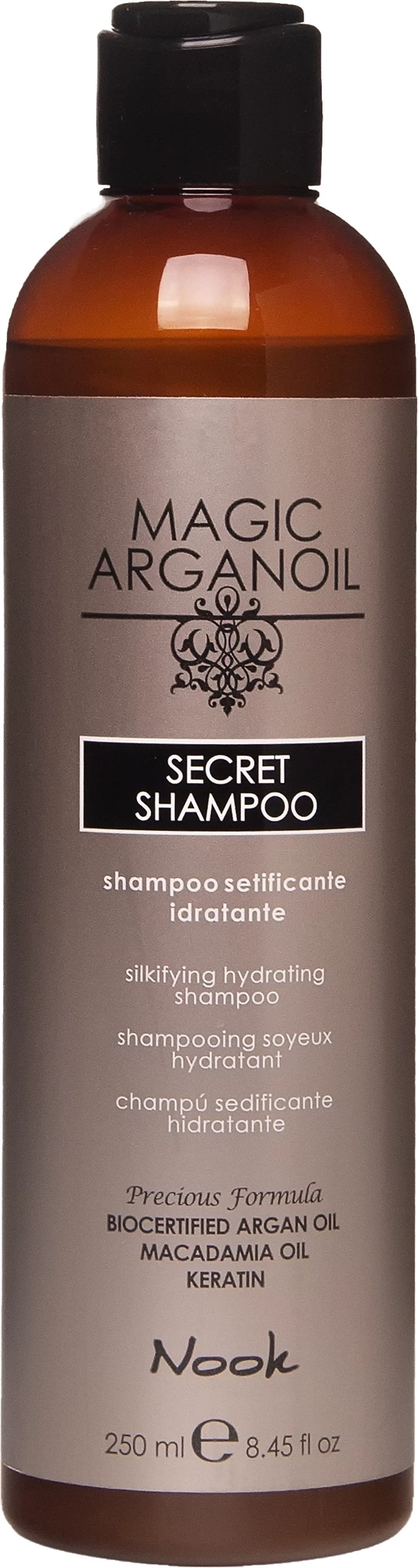 Збагачений сертифікованою аргановою олією і кератином з цінними живильними, реструктурувальними і оживляючими властивостями. М'яко очищає, надаючи блиску, зволоження і відчуття шовковистості. Залишає волосся м'яким, яскравим, легким. Шампунь особливо рекомендований для виснаженого, сухого волосся.